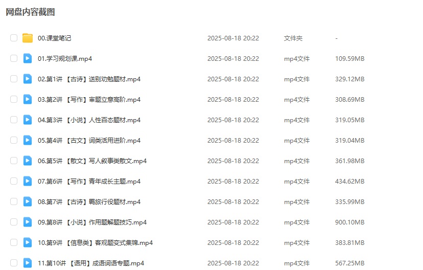 作业帮李秋颖2026学年高二语文上学期暑秋联报,暑假班更新完毕,秋季班同步更新中 暑假班 01.学习规划课.mp4 02.第1讲【古诗]送别劝勉题材.mp4 03.第2讲 [写作]审题立意高阶.mp4 04.第3讲 【小说]人性百态题材.mp4 05.第4讲 [古文]词类活用进阶.mp4 06.第5讲 [散文]写人叙事类散文.mp4 07.第6讲 [写作]青年成长主题.mp4 08.第7讲 [古诗]羁旅行役题材.mp4 09.第8讲 【小说]作用题解题技巧.mp4 10.第9讲【信息类]客观题变式集锦.mp4 11.第10讲【语用]成语词语专题.mp4 秋季班 01.第1讲【古诗]山水田园题材.mp4 02.第2讲[小说]战争哲思题材.mp4 03.第3讲[写作]结构升级技巧.mp4 (秋季班同步更新中,每周一课)