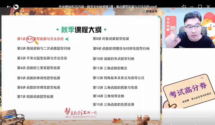 作业帮徐迅2026学年高一数学上学期暑秋联报,暑假班更新完毕,秋季班同步更新中 暑假班 百度网盘下载 秋季班 01.第1讲 集合题型拓展与方法总结.mp4 02.第2讲 简易逻辑与二次函数题型归纳.mp4 03.第3讲不等式题型拓展与方法总结.mp4 04.第4讲函数的三要素题型拓展.mp4 05.第5讲函数的单调性题型拓展.mp4 (秋季班同步更新中,每周一课)