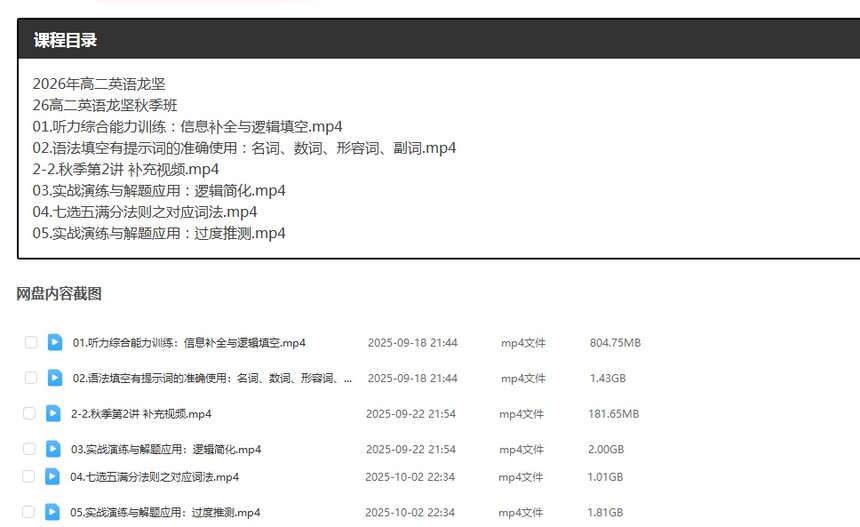 开明致学龙坚2026学年高二英语上学期暑秋联报,暑假班更新完毕,秋季班同步更新中名师简介:龙坚毕业于北大光华管理学院,精通英语和日语。他拥有20余年中高考英语教学经验,曾担任新东方高管、新东方集团英语教研团队负责人,也是前字节跳动教育线(大力教育)高管。 教学特色 高效解题方法:独创“6分钟抓主旨法”“三一致原则”等高效解题技巧,专治高考英语“时间不够、读不懂、做不对”三大痛点,帮助学生快速提高答题速度和正确率。 课程体系完善:课程分为暑、秋、寒、春四个阶段,从基础夯实到冲刺拔高,针对不同年级学生的特点和需求,设计了系统的教学内容,助力学生逐步提升英语能力。 个性化教学:能够针对不同学习进度和基础的学生,制定个性化的学习计划,同时通过定期的作业、测试和学习情况反馈,及时调整教学策略,确保学习效果。 教学成就:龙坚授课学员超百万,2023年学员最高分为147分,所带学生高考平均提分30-50分。此外,他还曾在北京、山东等多个省份进行过数十场大型讲座,授课学生人数达数万人。 学生及家长评价:家长真实反馈孩子跟课3个月,英语从90分提升到125分,阅读错误率降30%。学生们也认为龙坚老师的课程干货密集,幽默风趣,能有效帮助他们提升英语成绩和学习兴趣。 教学课程:2026年龙坚高二英语上学期暑秋班视频教程+讲义(课程持续同步更新中,已购课程包含更新至完结,无需二次付费)