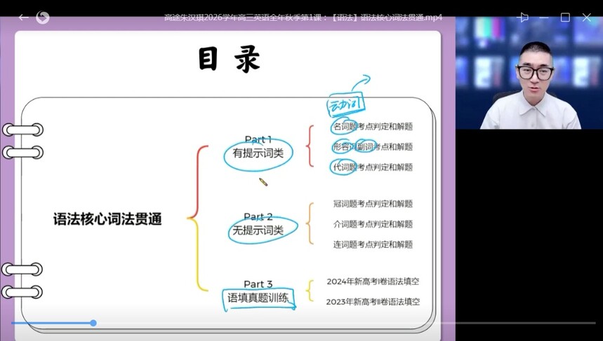 高途朱汉琪2026学年高三英语上学期暑秋联报,暑假班更新完毕,秋季班同步更新中名师简介:朱汉祺是中国人民大学与美国南加州大学联合培养的中美两国博士,同时也是国家公派交流学者,拥有英语专业八级资格和剑桥英语教学能力TKT认证。他曾在新东方历任词汇速记项目负责人、听力口语项目负责人等,2020年起入驻高途课堂担任英语主讲,并负责英语师训教研工作,2021年还担任过“21世纪杯”全国英语演讲比赛决赛评审。 教学特色 方法新颖:他开创“短段落串联记忆法”,通过40篇原创短文来串联高中3500词汇,融入语境记忆方式,并根据艾宾浩斯遗忘曲线设计了7冲卡记忆机构,提高词汇记忆效率。 课程多元:课程会依据学生基础差异进行个性化定制,并且覆盖词汇、语法、阅读、写作等英语学习各方面,还搭配在线互动课堂与课后答疑等多元学习形式。 讲解生动:朱汉祺在教学中能结合弹琴、唱歌等多种才艺,让课堂氛围轻松有趣,使复杂知识变得通俗易懂。 教学成就:朱汉祺有10年英语教学培训研究经验,曾作为新东方培训师培养过上千名英语讲师,讲座受众达数万人,还创造过让学员半年英语成绩提分72分的突出成果。 学生及家长评价:学生与家长普遍称赞朱汉祺知识渊博、耐心热心,课程重点突出、干货满满,能让原本在学校听不懂的知识变得易于理解,其新颖高效的技巧方法还刷新了很多人对英语学习的认知。 教学课程:2026年高三英语一轮复习暑秋季班视频教程(课程持续同步更新中,已购课程包含更新至完结,无需二次付费)