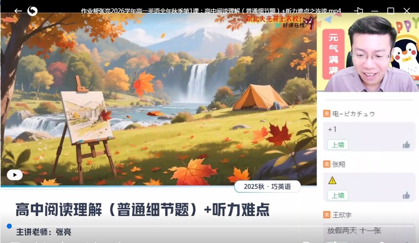作业帮张亮2026学年高一英语上学期暑秋联报,暑假班更新完毕,秋季班同步更新中名师简介:张亮毕业于北京大学,是高考状元。他是作业帮高中七周年荣誉教师、“top讲师”,还担任作业帮高中英语主讲老师、教师培训师、师训考试特聘命题人等职务。他累计学员百万,带领教研团队研发编撰课程教辅90余本,设计了高中英语课程产品体系,独创的教学法受到人民网等众多知名媒体报道。 教学特色 幽默风趣的教学风格:张亮被称为“押韵狂魔”,他的课堂如脱口秀现场,用幽默金句、Rap式节奏和网感化表达,将知识点融入梗中,让学生在笑声中学习,降低理解门槛,提升记忆粘性。 精准高效的解题技巧:他针对高考英语的各种题型总结了实用的解题技巧,如“暴力跳读法”“七选五技巧”等,还独创了词汇记忆体系,通过词根词缀法等帮助学生记忆单词,用40个语法公式让学生轻松掌握复杂语法。 个性化的教学方案:张亮英语团队会根据学生的英语基础和学习目标,为每位学生量身定制个性化的学习方案,同时课程覆盖高二到高三关键阶段,A+班和A 班针对不同学习层次的学生提供个性化教学内容。 教学成就:张亮帮助200w+学生英语成绩逆袭提升,带出的学员中,有一个月最高提分40+的壮举,更有大批学子成功考入北京大学、复旦大学、浙江大学等顶尖名校。 学生及家长评价:学生们认为张亮的课幽默且干货满满,跟着他学习能轻松掌握知识点和解题技巧,成绩提升显著。家长们则表示孩子在张亮老师的引导下,不仅英语成绩提高了,还找到了学习英语的信心,学习的主动