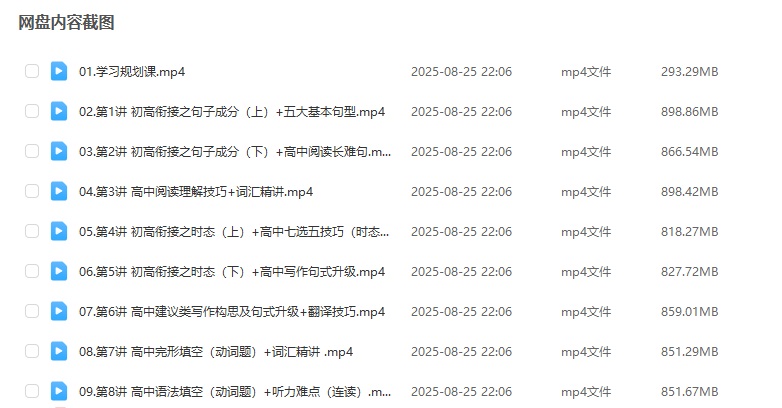作业帮张亮2026学年高一英语上学期暑秋联报,暑假班更新完毕,秋季班同步更新中 01.暑假班 01.学习规划课.mp4 02.第1讲 初高衔接之句子成分(上)+五大基本句型.mp4 03.第2讲 初高衔接之句子成分(下)+高中阅读长难句.mp4 04.第3讲 高中阅读理解技巧+词汇精讲.mp4 05.第4讲 初高衔接之时态(上)+高中七选五技巧(时态类).mp4 06.第5讲 初高衔接之时态(下)+高中写作句式升级.mp4 07.第6讲 高中建议类写作构思及句式升级+翻译技巧.mp4 08.第7讲 高中完形填空(动词题)+词汇精讲.mp4 09.第8讲 高中语法填空(动词题)+听力难点(连读).mp4