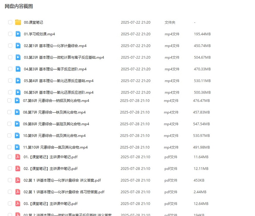 作业帮林森2026学年高三化学上学期暑秋联报,暑假班更新完毕,秋季班同步更新中 ├── 01.暑假班 │ ├── 课程目录: │ ├── 01.学习规划课.mp4 │ ├── 02.第1讲 基本理论—化学计量综合.mp4 │ ├── 03.第2讲 基本理论—微粒计算与离子反应基础.mp4 │ ├── 04.第3讲 基本理论—离子反应进阶.mp4 │ ├── 05.第4讲 基本理论—氧化还原反应基础.mp4 │ ├── 06.第5讲 基本理论—氧化还原反应进阶.mp4 │ ├── 07.第6讲 元素综合—钠铝及其化合物.mp4 │ ├── 08.第7讲 元素综合—铁及其化合物.mp4 │ ├── 09.第8讲 元素综合—氯硅及其化合物.mp4 │ ├── 10.第9讲 元素综合—硫及其化合物.mp4 │ ├── 11.第10讲 元素综合—氮及其化合物.mp4 ├── 02.秋季班 │ ├── 课程目录: │ ├── 01.第1讲 工业流程初探—原料处理与反应条件控制.mp4 │ ├── 02.第2讲 工业流程初探—生产过程中的杂质处理.mp4 │ ├── 03.第3讲 工业流程初探—杂质处理进阶与产品分离提纯.mp4 │ ├── 04.第4讲 结构综合—元素周期表与周期律.mp4 │ ├── 05.第5讲 结构综合—分子的结构与性质.mp4 (秋季班同步更新中,每周一课)