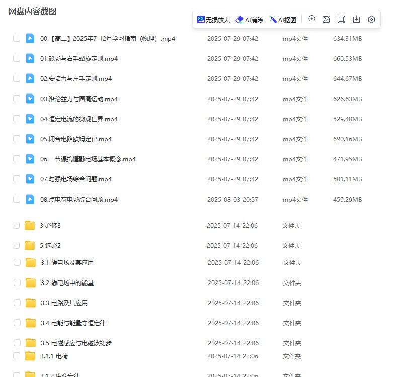 李楠2026学年高二物理上学期暑秋联报,暑假班更新完毕,秋季班同步更新中 2026年高二物理李楠 2026年高二有道物理李楠电子讲义 3_【终稿]高二物理精讲精练(上)配套习题.pdf4_【终稿]高二物理学业规划与方法指导(上).pdf4【终稿]高二物理精讲精练(上).pdf2026高二有道物理李楠上学期暑假班知识视频3必修3 3.1 静电场及其应用 3.1.1电荷 3.1.1.1电荷与静电感应.mp4 3.1.1.2 电荷守恒定律.mp4 3.1.2库仑定律 3.1.2.1库仑定律与库仑扭秤实验.mp4 3.1.2.2库仑力作用下的平衡问题.mp4 3.1.3 电场和电场强度 3.1.3.1 电场强度.mp4 3.1.3.2 电场线.mp4 3.1.3.3 点电荷场强叠加问题.mp4 3.1.4 静电的防止与利用 3.1.4.1 静电平衡.mp4 3.1.4.2尖端放电、静电屏蔽、静电吸附.mp4 3.2 静电场中的能量 3.2.1 电势能和电势 3.2.1.1 静电力做功与电势能.mp4 3.2.1.2 电势.mp4 3.2.1.3 电场方向与电势大小的判断.mp4 3.2.1.4 点电荷电势与电势能.mp4 3.2.2电势差 3.2.2.1 电势差.mp4 3.2.2.2 等势面.mp4 3.2.3 电势差与电场强度的关系 3.2.3.1电势差与场强的关系.mp4 3.2.3.2 电场中的电势图像.mp4 3.2.3.3 电场中的场强图像.mp4 3.2.3.4 带电粒子轨迹问题.mp4 3.2.4 电容器的电容 3.2.4.1 电容器.mp4 3.2.4.2 电容.mp4 3.2.4.3 平行板电容器动态分析.mp4 3.2.5 带电粒子在电场中的运动 3.2.5.1 带电粒子在电场中的加速.mp4 3.2.5.2带电粒子在电场中的偏转.mp4 3.2.5.3带电粒子在电场中的加速偏转综合.mp4 3.3 电路及其应用 3.3.1 电源和恒定电流 3.3.1.1 电源和恒定电流.mp4 3.3.2导体的电阻 3.3.2.1 电阻.mp4 3.3.3 串联电路和并联电路 3.3.3.1串联电路和并联电路的规律.mp4 3.3.3.2 电压表和电流表的电路结构.mp4 3.3.4实验:导体电阻率的测量 3.3.4.1长度的测量及测量工具的选用.mp4 3.3.4.2 测量电路的选择.mp4 3.3.4.3 控制电路的选择.mp4 3.3.4.4 实验:导体电阻率的测量.mp4 3.4 电能与能量守恒定律 3.4.1 电路中的能量转化 3.4.1.1电路中的功能关系.mp4 3.4.2 闭合电路欧姆定律 3.4.2.1闭合电路欧姆定律.mp4 3.4.2.2 电路中的功率与效率.mp4 3.4.2.3非纯电阻电路.mp4 3.4.2.4闭合电路的动态分析.mp4 3.4.2.5实验:半偏法测电表内阻.mp4 3.4.3 实验:认识和使用多用电表 3.4.3.1实验:认识和使用多用电表.mp4 3.4.4 实验:电池电动势和内阻的测量 3.4.4.1实验:电池电动势和内阻的测量.mp4 3.4.5 实验:描绘小灯泡伏安特性曲线 3.4.5.1实验:描绘小灯泡伏安特性曲线.mp4 3.5 电磁感应与电磁波初步 3.5.1 磁场与磁感线 3.5.1.1 磁场与磁感线.mp4 3.5.1.2 安培定则.mp4 3.5.2 磁感应强度 3.5.2.1磁感应强度.mp45选必2 5.1 安培力与洛伦兹力 5.1.1磁场对通电导线的作用力 5.1.1.1 安培力的方向.mp4 5.1.1.2 安培力的大小.mp4 5.1.1.3 安培力的应用.mp4 5.1.2 磁场对运动电荷的作用力 5.1.2.1 洛伦兹力.mp4 5.1.3带电粒子在匀强磁场中的运动 5.1.3.1带电粒子在匀强磁场中的运动.mp4 5.1.3.2 科学思维一几何法找圆心.mp4 5.1.3.3科学思维一偏转角法.mp4 5.1.3.4科学思维一半径公式.mp4 5.1.3.5 科学思维一弦长公式.mp4 5.1.4.2 回旋加速器.mp4 5.1.5 带电粒子在有界场中的运动 5.1.5.1 直线边界磁场.mp4 5.1.5.2 圆形边界磁场.mp4 5.1.6离子源问题 5.1.6.1 动态圆问题.mp4 5.1.6.2 磁聚焦和磁发散.mp4规划服务李楠暑假班 00.【高二]2025年7-12月学习指南(物理).mp401.磁场与右手螺旋定则.mp402.安培力与左手定则.mp403.洛伦兹力与圆周运动.mp404.恒定电流的微观世界.mp405.闭合电路欧姆定律.mp4 06.一节课搞懂静电场基本概念.mp407.匀强电场综合问题.mp408.点电荷电场综合问题.mp4试听课 3.1.1.1 电荷与静电感应.mp4 3.1.1.2 电荷守恒定律.mp4 3.1.2.1库仑定律与库仑扭秤实验.mp4 3.1.2.2 库仑力作用下的平衡问题.mp4 3.1.3.1 电场强度.mp4 3.1.3.2 电场线.mp4 3.1.3.3 点电荷场强叠加问题.mp4 3.1.4.1 静电平衡.mp4 3.1.4.2 尖端放电、静电屏蔽、静电吸附.mp4 3.2.1.1 静电力做功与电势能.mp4 3.2.1.2 电势.mp4 3.2.1.3 电场方向与电势大小的判断.mp4 3.2.1.4 点电荷电势与电势能.mp4 3.2.2.1电势差.mp4 3.2.2.2 等势面.mp4 3.2.3.1 电势差与场强的关系.mp4 3.2.3.2 电场中的电势图像.mp4 3.2.3.3 电场中的场强图像.mp4 3.2.3.4 带电粒子轨迹问题.mp4 3.2.4.1 电容器.mp4 3.2.4.2 电容.mp4 3.2.4.3 平行板电容器动态分析.mp4 3.2.5.1带电粒子在电场中的加速.mp4 3.2.5.2带电粒子在电场中的偏转.mp4 3.2.5.3带电粒子在电场中的加速偏转综合.mp 3.3.1.1 电源和恒定电流.mp4 3.3.2.1 电阻.mp4 3.3.3.1 串联电路和并联电路的规律.mp4 3.3.3.2 电压表和电流表的电路结构.mp4 3.3.4.1长度的测量及测量工具的选用.mp4 3.3.4.2 测量电路的选择.mp4 3.3.4.3控制电路的选择.mp4 3.3.4.4实验:导体电阻率的测量.mp4 3.4.1.1 电路中的功能关系.mp4 3.4.2.1闭合电路欧姆定律.mp4 3.4.2.2 电路中的功率与效率.mp4 3.4.2.3非纯电阻电路.mp4 3.4.2.4闭合电路的动态分析.mp4 3.4.2.5 实验:半偏法测电表内阻.mp4 3.4.3.1实验:认识和使用多用电表.mp4