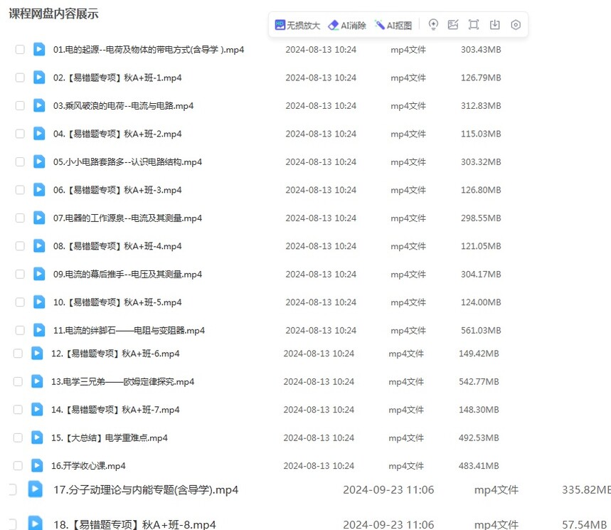 作业帮付雷2025学年初三物理上学期下学期全年暑秋寒春 秋上(暑假班) 00.大纲(每节课开课时间查询).pdf 01.电的起源–电荷及物体的带电方式(含导学 ).mp4 02.【易错题专项】秋A+班-1.mp4 03.乘风破浪的电荷–电流与电路.mp4 04.【易错题专项】秋A+班-2.mp4 05.小小电路套路多–认识电路结构.mp4 06.【易错题专项】秋A+班-3.mp4 07.电器的工作源泉–电流及其测量.mp4 08.【易错题专项】秋A+班-4.mp4 09.电流的幕后推手–电压及其测量.mp4 10.【易错题专项】秋A+班-5.mp4 11.电流的绊脚石——电阻与变阻器.mp4 12.【易错题专项】秋A+班-6.mp4 13.电学三兄弟——欧姆定律探究.mp4 14.【易错题专项】秋A+班-7.mp4 15.【大总结】电学重难点.mp4 16.开学收心课.mp4 17.分子动理论与内能专题(含导学).mp4 18.【易错题专项】秋A+班-8.mp4 19.比热容、热机专题.mp4 20.【易错题专项】秋A+班-9.mp4 21.热机的效率及电路基础专题.mp4 22.【易错题专项】秋A+班-10.mp4 23.【月度点睛课】(1) 24.电流和电压专题 25.【易错题专项】秋A+班-11 26.电流和电压专题 27.【易错题专项】秋A+班-12 01-27.【课堂笔记】主讲课中笔记 秋下(秋季班) 01.电阻及电路故障专题.mp4 02.【易错题专项】秋A+班-13.mp4 03.欧姆定律及等效电阻专题.mp4 04.【易错题专项】秋A+班-14.mp4 05.【月度点睛课】(2).mp4 06.欧姆定律多状态电路计算.mp4 07.【易错题专项】秋A+班-15.mp4 08.欧姆定律动态分析与比例计算.mp4 09.【易错题专项】秋A+班-16.mp4 10.欧姆定律图像计算与范围极值问题.mp4 11.【易错题专项】秋A+班-17.mp4 12.电阻的测量专题.mp4 13.【易错题专项】秋A+班-18.mp4 14.【月度点睛课】(3).mp4 15.电功和电功率专题.mp4 16.【易错题专项】秋A+班-19.mp4 17.电功率计算专题.mp4 18.【易错题专项】秋A+班-20.mp4 19.电功率的测量专题.mp4 20.【易错题专项】秋A+班-21.mp4 21.焦耳定律专题.mp4 22.【易错题专项】秋A+班-22.mp4 23.【月度点睛课】(4).mp4 24.家庭电路及其故障分析专题.mp4 25.【易错题专项】秋A+班-23.mp4 26.电与磁专题.mp4 27.【易错题专项】秋A+班-24.mp4 春上(寒假班) 01.【一轮复习】力的特点及三种力.mp4 02.【易错题专项】春A+班TY-1.mp4 03.【一轮复习】力与运动及受力分析.mp4 04.【易错题专项】春A+班TY-2.mp4 05.【一轮复习】固体压强及其经典计算.mp4 06.【易错题专项】春A+班TY-3.mp4 07.【一轮复习】液体压强及大气压强.mp4 08.【易错题专项】春A+班TY-4.mp4 09.【一轮复习】浮力的计算及浮沉条件.mp4 10.【易错题专项】春A+班TY-5.mp4 11.【一轮复习】简单机械与机械能.mp4 12.【易错题专项】春A+班TY-6.mp4 13.【一轮复习】功和机械效率.mp4 14.【易错题专项】春A+班TY-7.mp4 15.【大总结】牛顿对对碰-A+班TY.mp4 16.开学收心课-A+班TY.mp4 17.【题型突破】声学与机械运动专题.mp4 18.【易错题专项】春A+班TY-8.mp4 19.【题型突破】光学专题.mp4 20.【易错题专项】春A+班TY-9.mp4 21.【题型突破】热学专题.mp4 22.【易错题专项】春A+班TY-10.mp4 23.【题型突破】力学探究实验专题.mp4 24.【易错题专项】春A+班TY-11.mp4 春下(春季班) 01.【一阶段点睛课]-A+班TY 02.[题型突破]力学综合计算--压强浮力.mp4 04.[题型突破]力学综合计算--功和机械.mp4 05.[易错题专项]春A+班TY-13 06.[题型突破]测密度专题、电与磁,mp4 07.【易错题专项]春A+班TY-14 08.[题型突破]电学探究实验专题.mp4 09.[易错题专项]春A+班TY-15.mp4 10.【二阶段点睛课]-A+班TY.mp4 11.[题型突破]电学测量实验专题.mp4 12.[易错题专项]春A+班TY-16.mp4 13.【题型突破]电学综合计算专题(一) 14.[易错题专项]春A+班TY-17.mp4